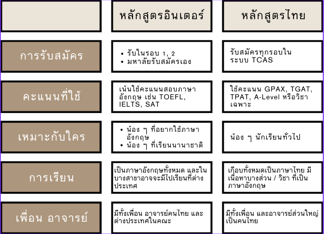 3. หลักสูตรไหนเหมาะกับใคร หลักสูตรอินเตอร์จะเหมาะกับน้อง ๆ ที่สนใจการใช้ภาษาอังกฤษ หรือสาขานั้น ๆ ที่มีเฉพาะในหลักสูตรอินเตอร์ และน้อง ๆ ที่จบการศึกษาจากโรงเรียนนานาชาติ หรือจบการศึกษามาจากต่างประเทศ ถ้าเป็นหลักสูตรไทย คือ น้อง ๆ นักเรียนที่สนใจทั่วไปได้เลยค่ะ